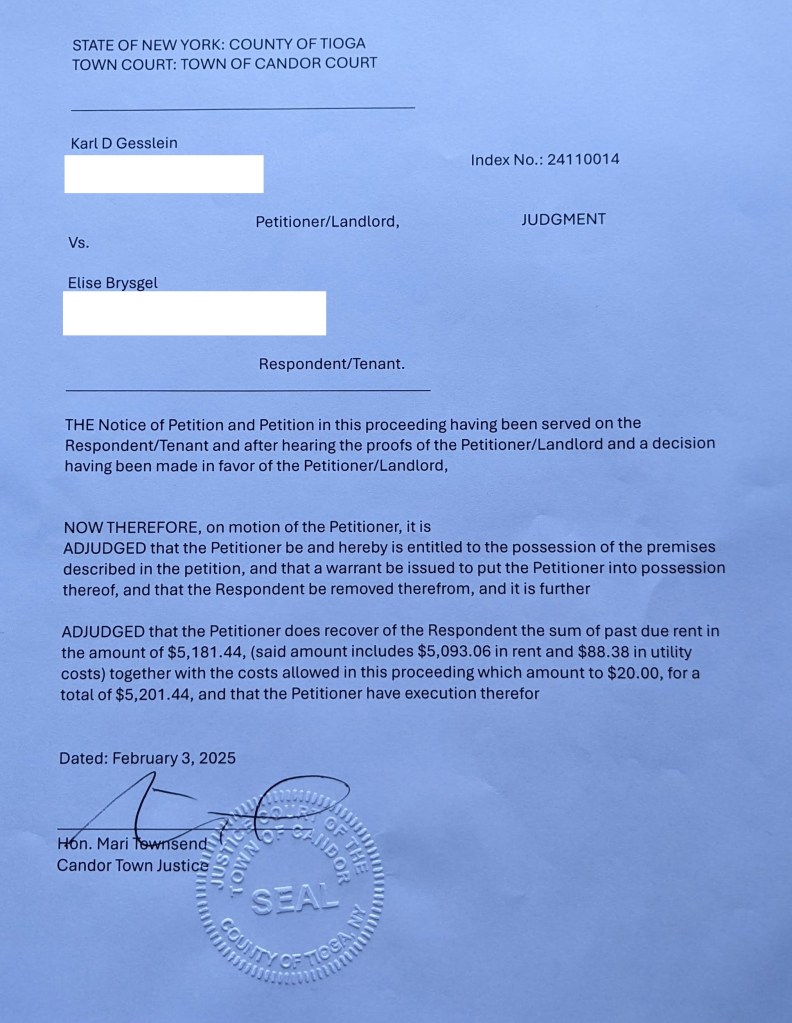Elise Brysgel owes me over $5200 in back rent. I chose to rent to Elise J Brysgel on April of 2024 when we signed a 1 year lease. She paid the Last months rent but bounced the very first check she gave me. She had 2 rental references, but both of them did not check out, one number did not work, the other the person never called me back. I wanted to rent to her and she owned a multi-unit rental in Connecticut. Knowing Elise Brysgel was a landlord herself I wondered ‘how bad could it possibly be’? Turns out it was pretty bad.